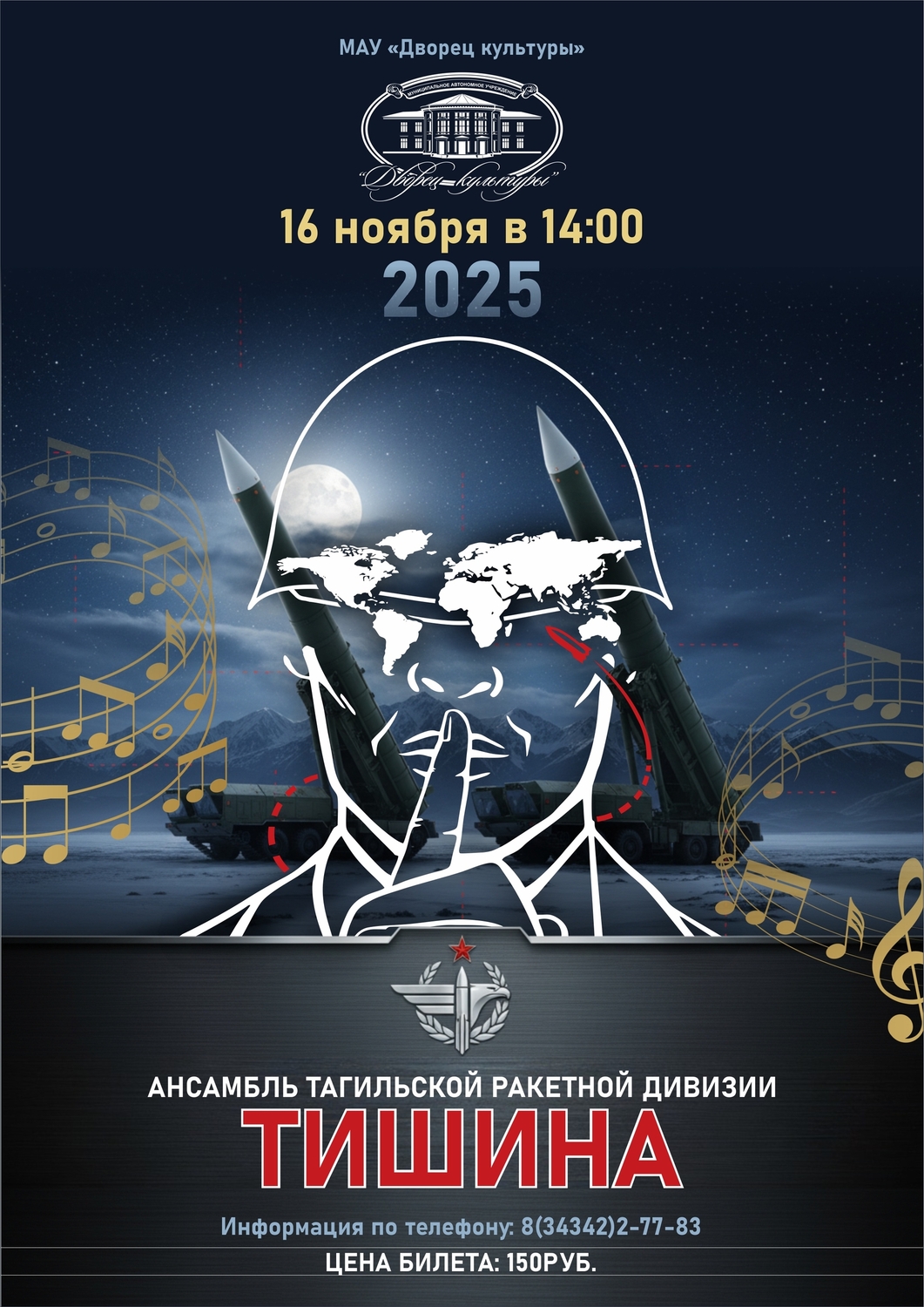 16 ноября, в субботу, во Дворце Культуры состоится концерт, который тронет сердце каждого. Для вас выступит ансамбль «Тишина» из Тагильской ракетной дивизии.