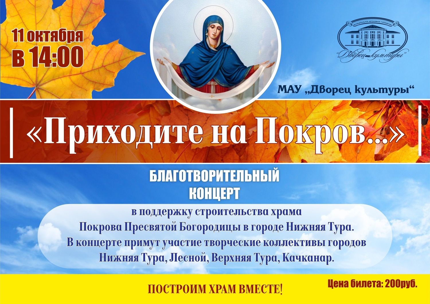 Приглашаем вас на благотворительный концерт «Приходите на Покров», который состоится 11 октября в 14:00 во Дворце культуры.
